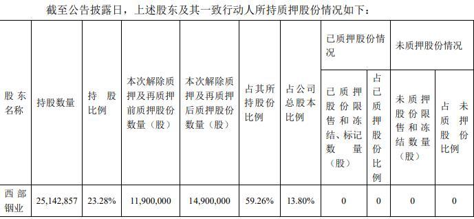 公示7月19日披露关于控制股权的人所持股份解除质押及再质押的公告,近日接到公司控制股权的人西部铟业的通知,获悉其将持有公司股份来了解质押及再质押的手续。截至公告披露日,西部铟业本次解除质押及再质押后质押股份数量14,900,000股,占其所持股份比例59.26%,占公司总股本比例13.80%。